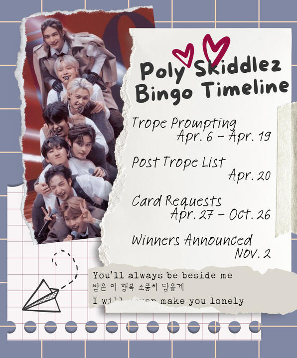 This fest does NOT allow non-con between the members of SKZ, zoophilia, bestiality, pedophilia, necrophilia, underage, or sexual age-play.Submissions will be tracked when users tag @PolySkiddlez in the main tweet or a reply. Links to Ao3 fics are perfectly fine!All fics made by non-private users will be added to the Notion.Please reach out through email or Retrospring with any questions
